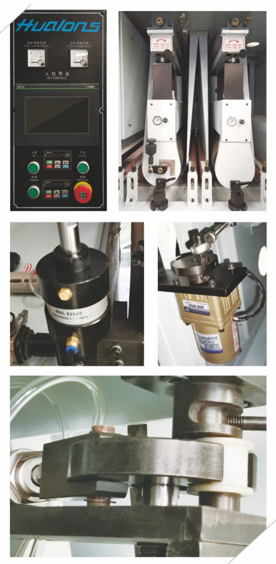Equipped with pneumatic protection devices, motor overheat protection, power failure protection, and automatic descent protection. The sanding belt oscillation is controlled by pneumatic pressure, unaffected by dust or power outages, ensuring balanced and uniform oscillation. Features a five-circuit fault display device. Photoelectric switch controls the sanding belt. Imported microcomputer controls sanding thickness. Imported brake resistors ensure machine safety. Sanding frame rises and falls, two sanding passes followed by one polishing pass.